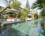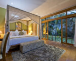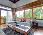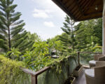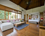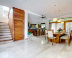 Beyond the carved entry doors we step into a lush garden that surrounds the inner property including the 25 meters lap pool, kid’s pool, and ironwood deck. Next to the pool are two identical bedrooms connected by an inside lockable door. All bedrooms have large private bathrooms attached. The open common area has wide sliding glass doors at either end allowing air to circulate around the spacious living room, dining room, and kitchen. Upstairs, the third and master bedrooms include walk-in closets, large private bathrooms, a cozy living space, and a separate office, part of the master bedroom. The hallway’s upstairs love seat can be a cool reading space or step outdoors onto the spacious wide-open patio.